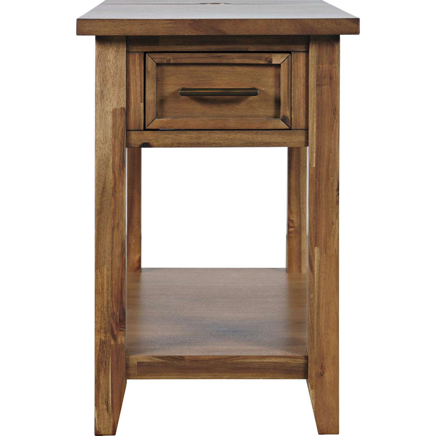 The table features a storage drawer and additional storage compartment, offering space to keep remotes, books, or other small essentials neatly organized. Its warm wood finish and classic hardware bring a touch of rustic character that blends easily with many décor styles.