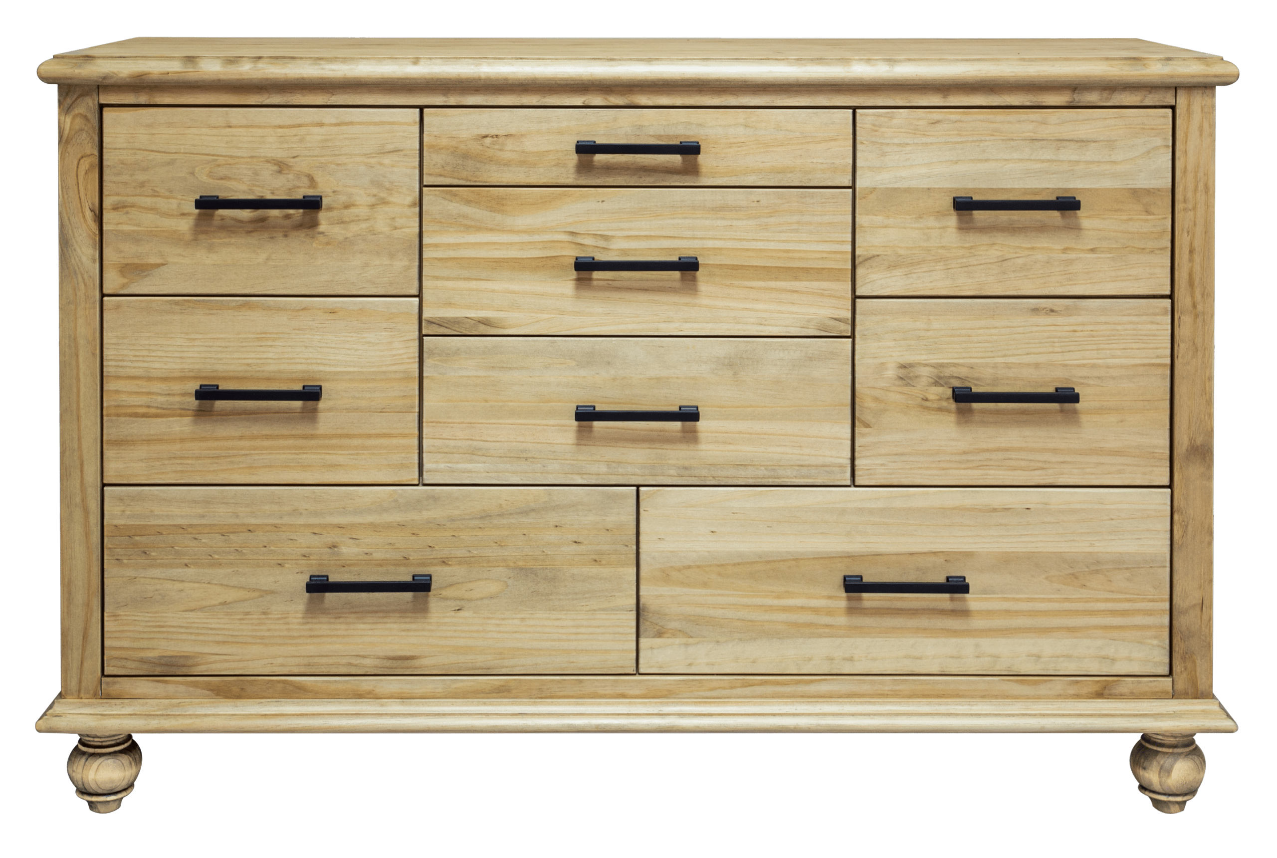 Enhance your bedroom with the Victoria 9-drawer Dresser, a timeless and functional storage solution crafted from solid pine wood. Designed for durability and elegance, this handmade dresser features a versatile storage layout with two standard drawers, six deep drawers, and one pencil drawer, providing ample space for clothing, accessories, and essentials.