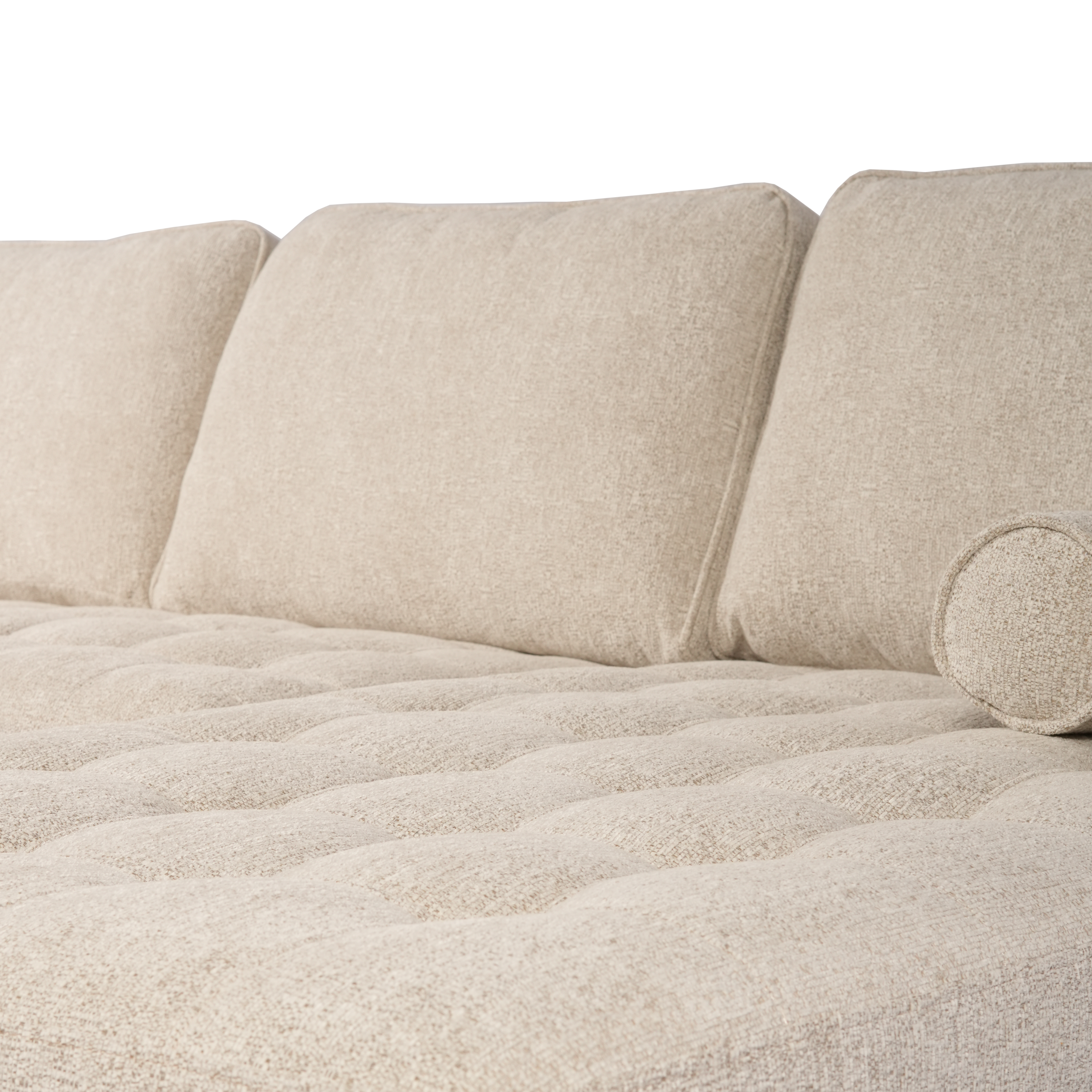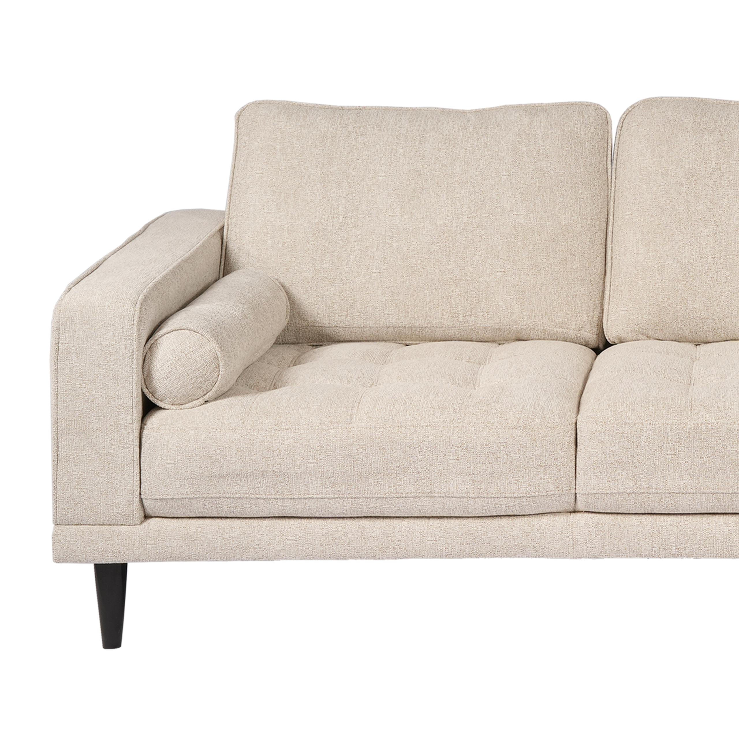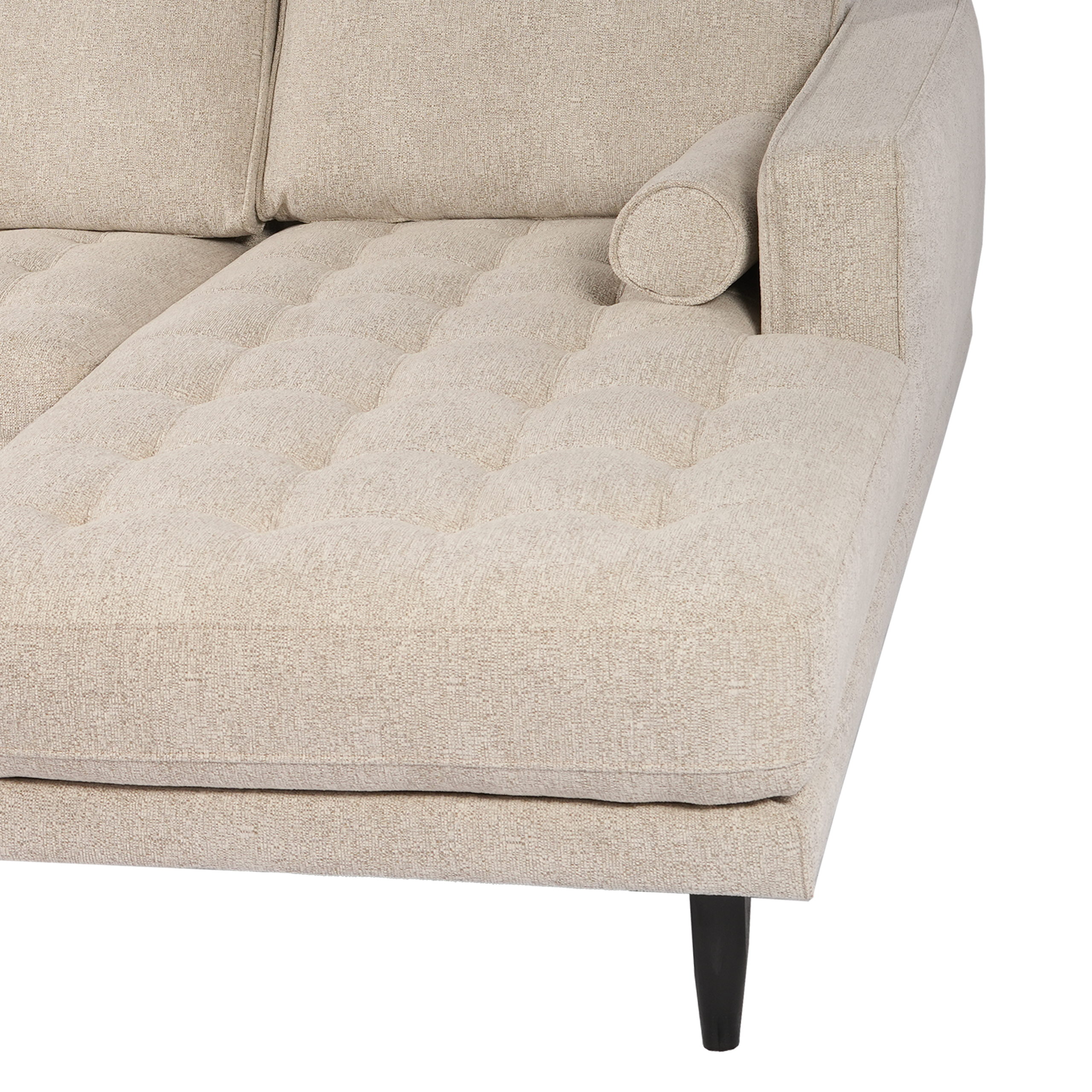 Upholstered in a soft, light neutral fabric, it features plush tufted seat cushions and supportive back cushions for everyday relaxation. The chaise provides a cozy spot to stretch out, while matching bolster pillows add both comfort and a polished finishing touch. Slim black tapered legs elevate the look with a modern feel and help keep the design light and airy.