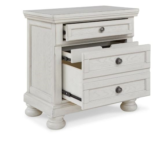 Elevate your bedroom decor with our Elegant Antiqued White Nightstand, a timeless piece that seamlessly combines style and functionality. This nightstand features a sophisticated antiqued white finish with a rich grain texture, exuding elegance and charm. The ornate dark bronze-tone hardware adds a touch of luxury, making it the perfect accent for any bedroom.