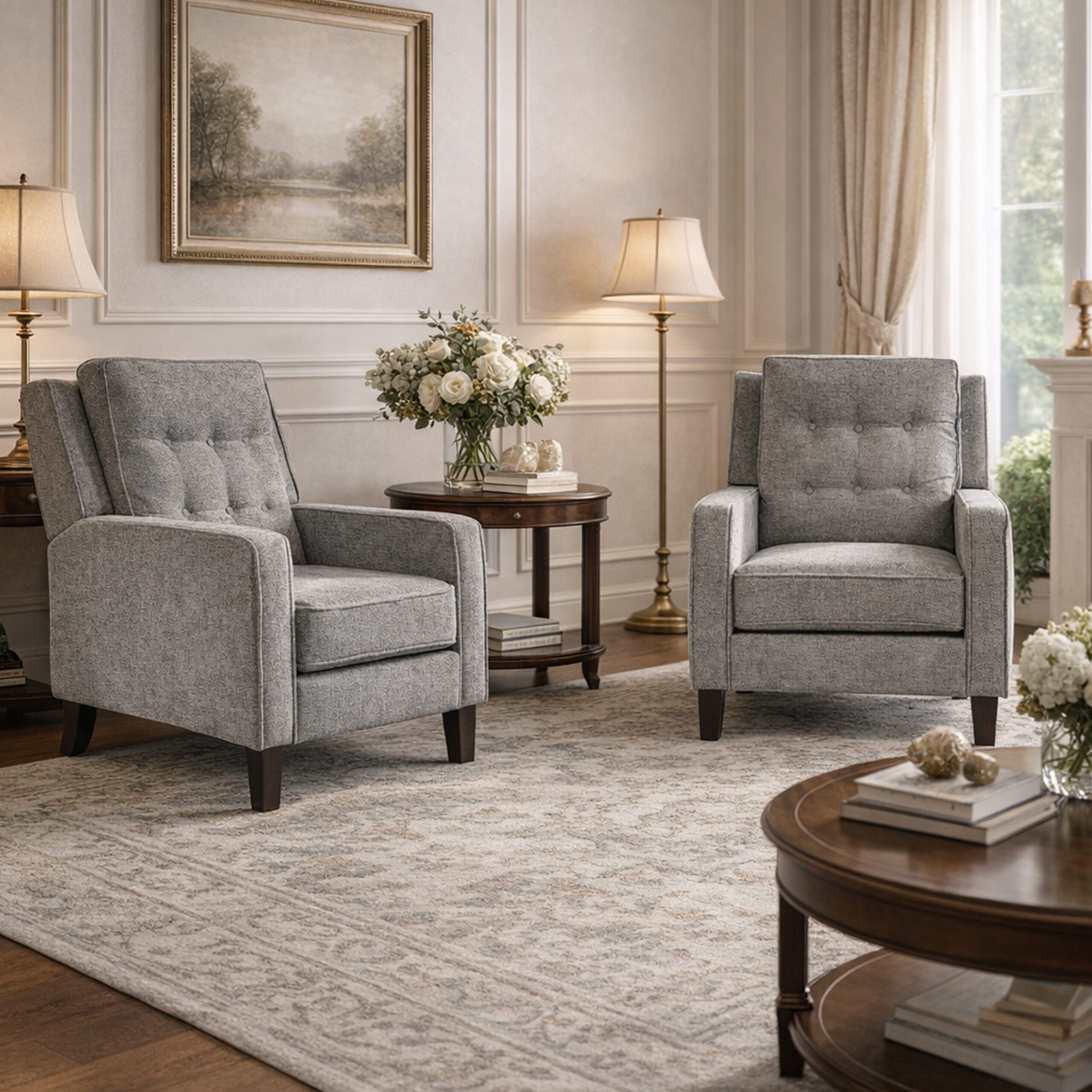 Its streamlined silhouette makes it a versatile choice for living rooms, reading corners, or cozy lounging spaces, while the plush cushioning provides inviting comfort for long evenings at home. Available in modern grey or blue upholstery options, the Reese Pushback Recliner blends seamlessly with a variety of décor styles while delivering the comfort and craftsmanship expected from Canadian-made furniture.